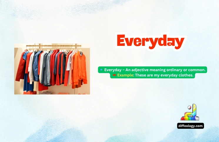 Everyday is one word used before a noun to say that the thing is normal, common, or part of routine. Say everyday clothes to mean clothes you wear normally, not formal clothes. Say everyday tasks to mean usual chores, not special jobs. In simple writing guides, everyday is listed as an adjective that shows something is ordinary and not rare.
