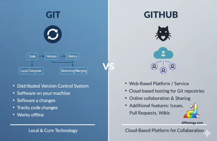 The main difference is easy to remember: Git is the tool that tracks changes on your own computer. GitHub is the website that stores those tracked changes and gives tools for teamwork. With Git you can work without internet. With GitHub you go online to share work, ask for feedback, and let others join your project. One tool handles versions, the other helps people share and manage the project.